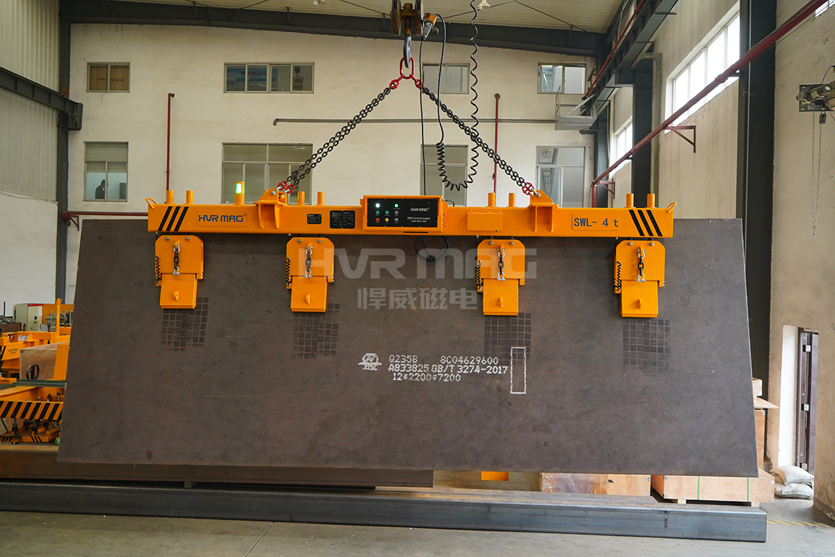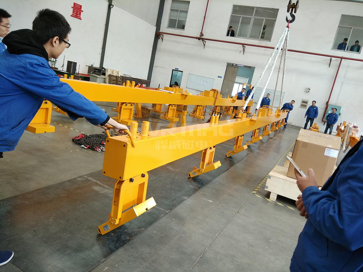 以下是悍威磁電最新生產的一套出口美國的側吊型鋼板吊磁力吊具試吊圖,額定起重能力為6噸,采用了6臺電永磁鐵聯(lián)合吊運的方式,幫助終端用戶實現(xiàn)對鋼板安全平穩(wěn)高效的搬運,技術上已經(jīng)超過美國,處于技術領先水平