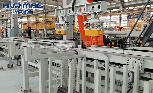 在汽車的生產(chǎn)過程中,利用電永磁吊具將薄鋼板等工件運送至數(shù)控機床進行切割時,由于電永磁吊具采用多點吸附方式,一方面不僅能避免薄鋼板在搬運過程中發(fā)生磕碰、甚至鋼板變形等現(xiàn)象,另一方面,由于電永磁吊具僅在充退磁瞬間0.1-2秒用電,因此可節(jié)約95%以上的電能。此外,在吊運薄板時,電永磁吊具可一次吊運起厚度為1.5mm-6mm的單張薄鋼板,確保不與第二張鋼板粘連,便于薄鋼板的上料,性能優(yōu)異又如此節(jié)能環(huán)保的設(shè)備誰能不愛?