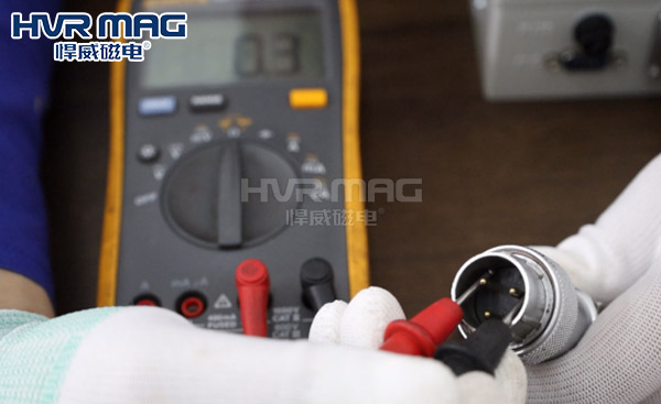 若萬用表電阻數(shù)值為零,則說明存在短路現(xiàn)象,此時需要檢查線路是否存在壓壞、破損的情況,修復(fù)磁鐵連線后,用電阻檔測量1腳和2腳之間的電阻,此時的電阻應(yīng)為電永磁吸盤銘牌上對應(yīng)的電阻數(shù)值。若線路正常,則說明磁鐵內(nèi)部已損壞,請及時聯(lián)系電永磁吸盤廠家的售后人員及時返廠修復(fù)。