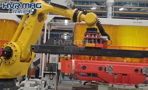 在自動化生產(chǎn)車間,工業(yè)機器人吸盤抓手是自動化搬運、碼垛的主要末端抓取設(shè)備,它決定著工業(yè)機器人能否將工件順利搬運至指定位置,且不對工件表面進行刮傷。機器人吸盤抓手的種類有很多種,如:氣動夾具、真空吸盤以及磁力吸盤等,今天悍威磁電小編給大家介紹的是由電永磁鐵構(gòu)成的機器人電永磁吸盤。