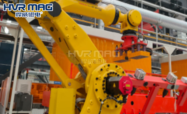 悍威磁電使用2臺HEPMP-2715P45X12-GW高溫電永磁鐵聯用到機器人上,搬運最重80公斤方管結構件(F80X80X壁厚6-8)到夾具組焊,實現自動化搬運上下料。