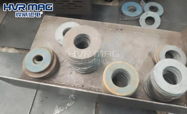 首先客戶的工件外徑有150-250mm不同大小,但是內(nèi)徑基本固定在3種大小,厚度也是固定的,由于客戶需要全部采用一套電永磁進(jìn)行搬運(yùn),需要考慮全部的兼容性。我們就根據(jù)內(nèi)徑的相差不大的特點(diǎn),選擇使用圓形磁鐵布置在內(nèi)徑周邊位置,考慮到需要進(jìn)行翻轉(zhuǎn)動(dòng)作,采用了直徑40mm,吸力20KG的4個(gè)圓形磁鐵搬運(yùn)。內(nèi)徑這個(gè)地方所有的工件基本都有相交叉的吸附面積,這樣就完成了所有工件的兼容性。