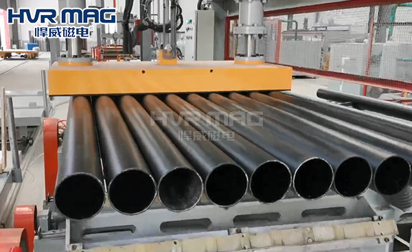 第三種工況的話就是中間會有一個圓管他的位置比其余幾根位置低數(shù)mm,悍威磁電則可通過充磁瞬間產(chǎn)生的磁場將其吸上來。以便達到可以搬運的工況。