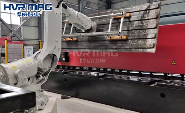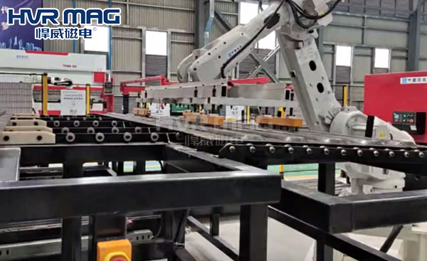 電永磁鐵作為工業(yè)生產(chǎn)中吸附工件的一大利器,除了可以作為電永磁起重器搬運鋼板、鋼管等工件之外,還可以將其安裝在工業(yè)機械手末端用來實現(xiàn)自動化搬運。今天電永磁吸盤廠家悍威磁電帶您走進車間,看下悍威機械手磁力吸盤吸附工件進行翻轉的車間實景案例。