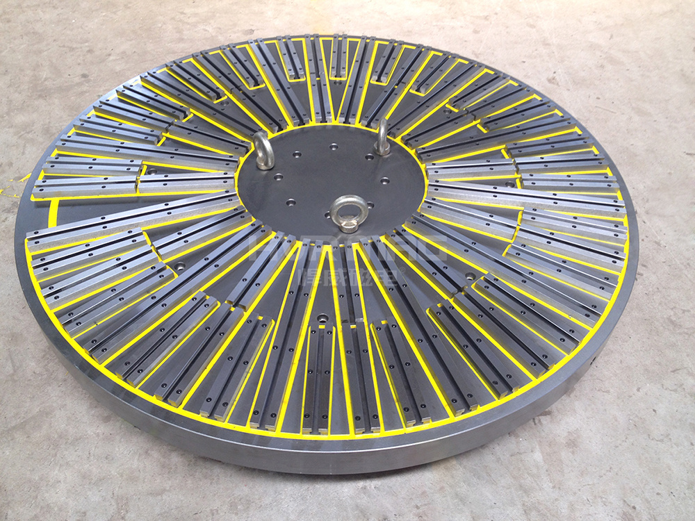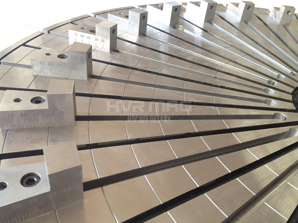 針對(duì)這種特殊的圓形工件,悍威磁電提供的設(shè)計(jì)方案是用多臺(tái)雙面電永磁吸盤組合使用替代原有夾具,每臺(tái)吸盤上下兩面均有磁力,可以自由組合擺放,用于不同工件的加工,相對(duì)傳統(tǒng)的電永磁吸盤,大大節(jié)約了企業(yè)的采購成本。