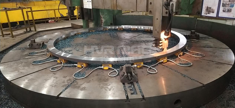 由于電永磁吸盤的磁吸力均勻穩(wěn)定,可以通過控制器控制充退磁,還可以和數(shù)控機(jī)床PLC系統(tǒng)連接,非常適用于大型自動(dòng)化車間生產(chǎn)線。下圖的數(shù)控立車加工臺(tái)面,就用到了悍威磁電的電永磁吸盤來對(duì)加工的風(fēng)機(jī)墊片進(jìn)行固定。