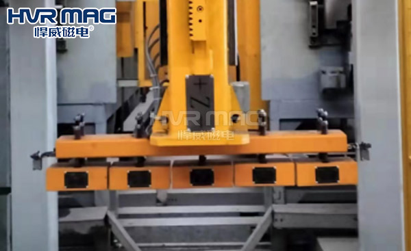 經(jīng)過悍威磁電的工程師詳細(xì)了解情況之后,根據(jù)該企業(yè)的實(shí)際工況需求,提供自動(dòng)化電永磁鐵定制解決方案,該方案組成為桁架機(jī)械手配套自動(dòng)化搬運(yùn)電永磁夾具,將型號(hào)為HEPMP-1610P30的電永磁鐵5臺(tái)組合形成一套機(jī)械手吸盤來進(jìn)行工件的上料操作。