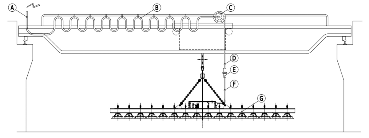A:輸入電源 B:行車滑線 C:電纜卷筒 D:卷筒升降電纜 E:重載連接器 F:電永磁控制系統(tǒng)電源進線 G:橫梁
