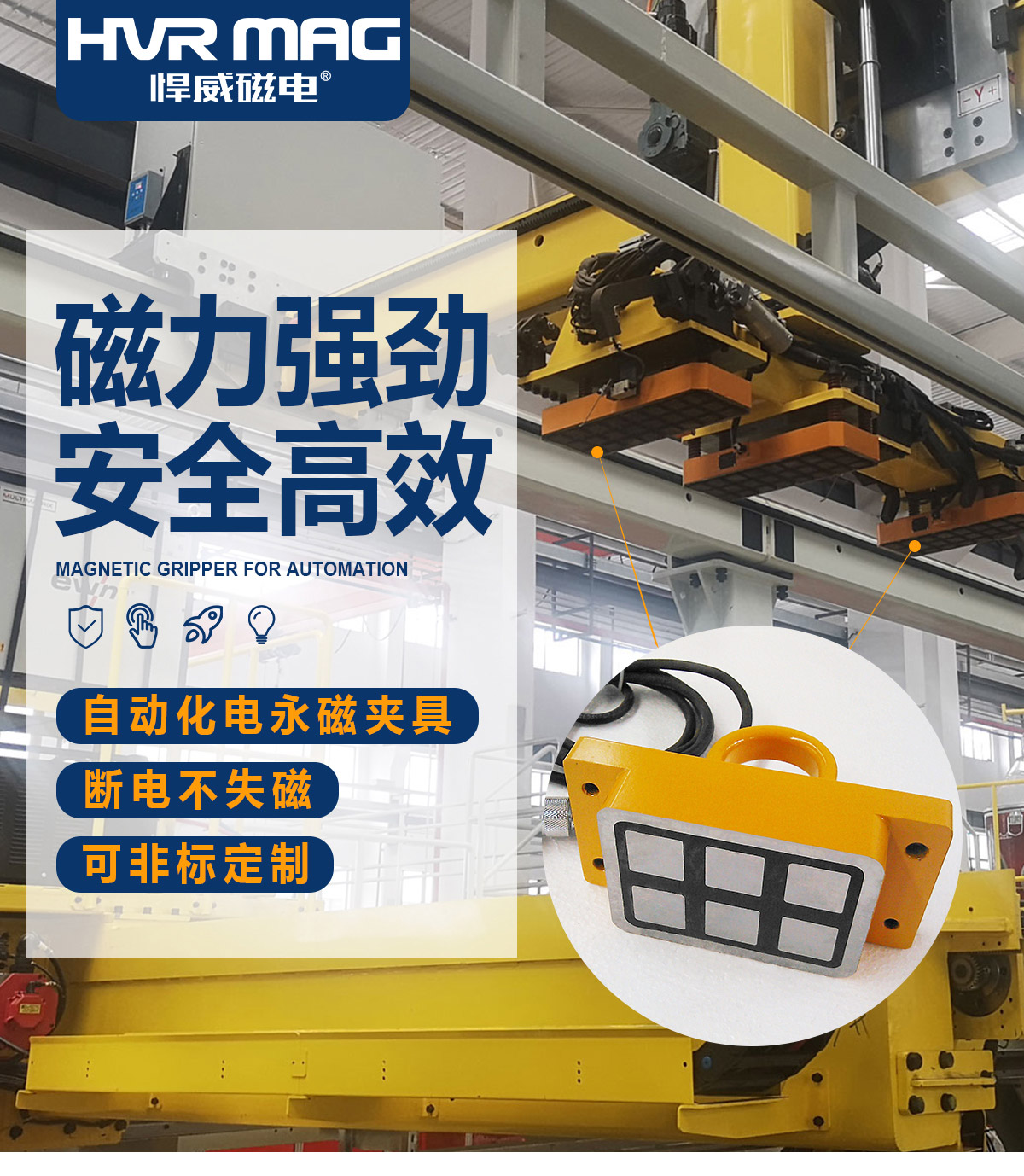 電永磁鐵可以用作桁架機器人上集成的磁力抓手,以拾取,提升,裝載,放置,搬運用于自動化生產(chǎn)線的鋼鐵材質工件,作為手臂的末端工具。磁力抓手既減少了時間,又減少了使流程自動化并確保流程順利進行所需的操作數(shù)。電永磁夾具的尺寸/形狀/抓力可根據(jù)客戶要求定制。