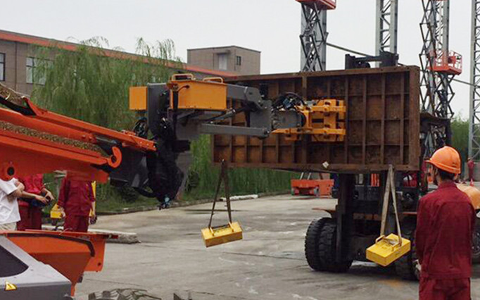 由悍威磁電專門設(shè)計(jì)生產(chǎn)的充電式磁力吊具,安裝在高空作業(yè)平臺(tái)車的末端,形成了一種獨(dú)特的可靈活移動(dòng)的磁力搬運(yùn)設(shè)備:可以從叉車上抓取模板,與平臺(tái)車一起將其搬運(yùn)到室內(nèi)車間,最后將其放置到指定的位置。