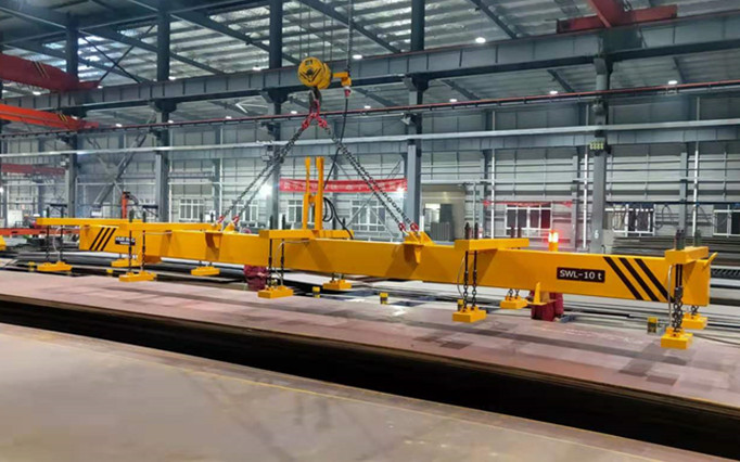 從圖片中可以看到,我們的客戶是河南省的一家鋼結(jié)構(gòu)公司,它利用我們的10噸工業(yè)吊裝磁鐵和橋式起重機(jī),將一塊大的重型鋼板吊到鋼的預(yù)處理線上。這種類型的鉤下提升裝置在橫梁上裝有5組磁性模塊,適用于各種尺寸的板,因?yàn)榇判阅K可以針對(duì)各種尺寸的板進(jìn)行選擇性激活/停用。指示燈為綠色,表示磁體已成功磁化。